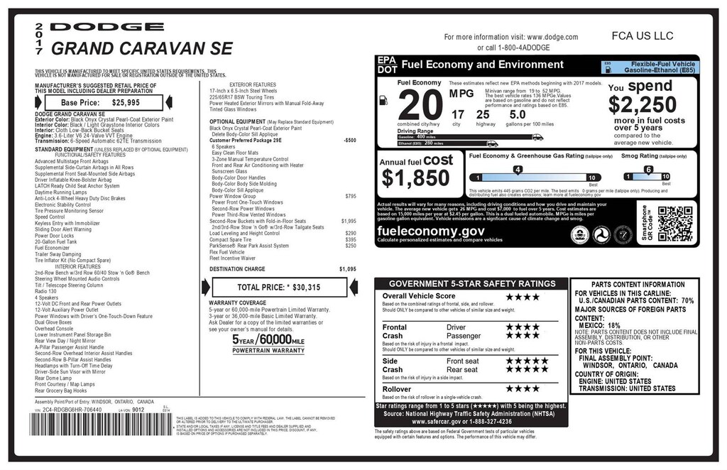 ENGINE: 3.6L V6 24V VVT FLEXFUEL, TRANSMISSION: 6-SPEED AUTOMATIC 62TE, QUICK ORDER PACKAGE 29E SE, BLACK ONYX CRYSTAL PEARLCOAT, BLACK/LIGHT GRAYSTONE, CLOTH LOW-BACK BUCKET SEATS, 2ND ROW BUCKETS W/FOLD-IN-FLOOR, POWER WINDOW GROUP, LOAD LEVELING & HEIGHT CONTROL, COMPACT SPARE TIRE, PARKSENSE REAR PARK ASSIST SYSTEM