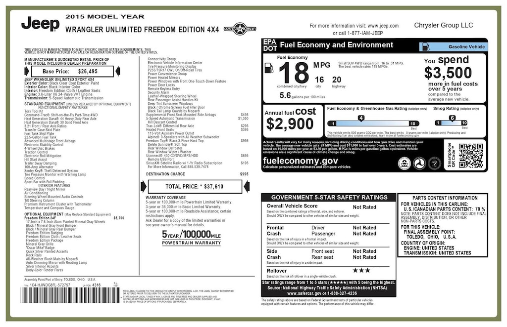 ENGINE: 3.6L V6 24V VVT, TRANSMISSION: 5-SPEED AUTOMATIC (W5A580), QUICK ORDER PACKAGE 24F FREEDOM EDITION, 3.21 REAR AXLE RATIO, BLACK CLEARCOAT, BLACK, FREEDOM EDITION CLOTH/LEATHER SEATS, ANTI-SPIN DIFFERENTIAL REAR AXLE, BLACK 3-PIECE HARD TOP, RADIO: UCONNECT 430 CD/DVD/MP3/HDD, SIRIUS SATELLITE RADIO, ALPINE 9-SPEAKER W/ALL WEATHER SUBWOOFER, HEATED FRONT SEATS, SUPPLEMENTAL FRONT SEAT SIDE AIR BAGS