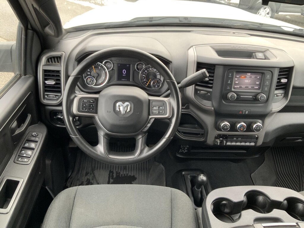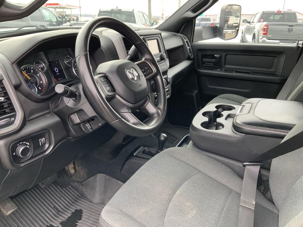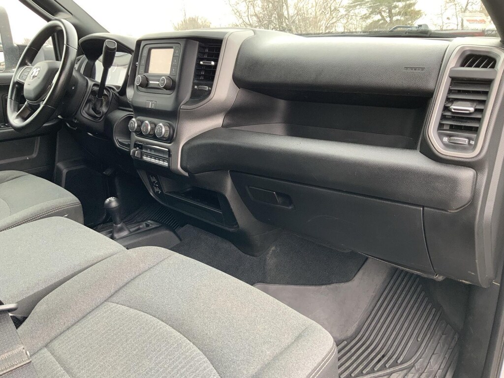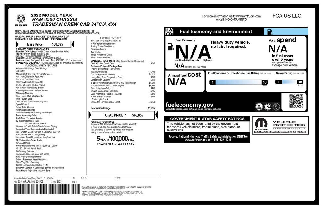 ENGINE: 6.7L I6 CUMMINS TURBO DIESEL, TRANSMISSION: 6-SPEED AUTO AISIN AS69RC HD, QUICK ORDER PACKAGE 2YA TRADESMAN, 4.44 AXLE RATIO, WHEELS: 19.5 X 6.0 STEEL, TIRES: 225/70R19.5G FT ALL POSITION, RR TRACTION, BRIGHT WHITE CLEARCOAT, BLACK, CLOTH 40/20/40 BENCH SEAT, GVWR: 16,500 LBS, CHROME APPEARANCE GROUP, MAX TOW PACKAGE, 220 AMP ALTERNATOR, DUAL ALTERNATORS RATED AT 440 AMPS, TRAILER BRAKE CONTROL, HEAVY DUTY FRONT SUSPENSION GROUP, 52 & 22 GALLON DUAL FUEL TANKS, REMOTE KEYLESS ENTRY, FLOOR COVERING CARPET